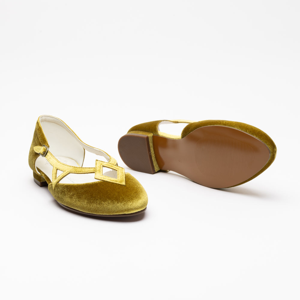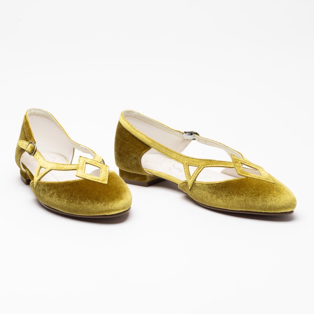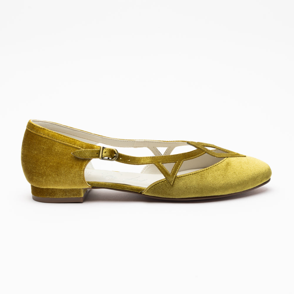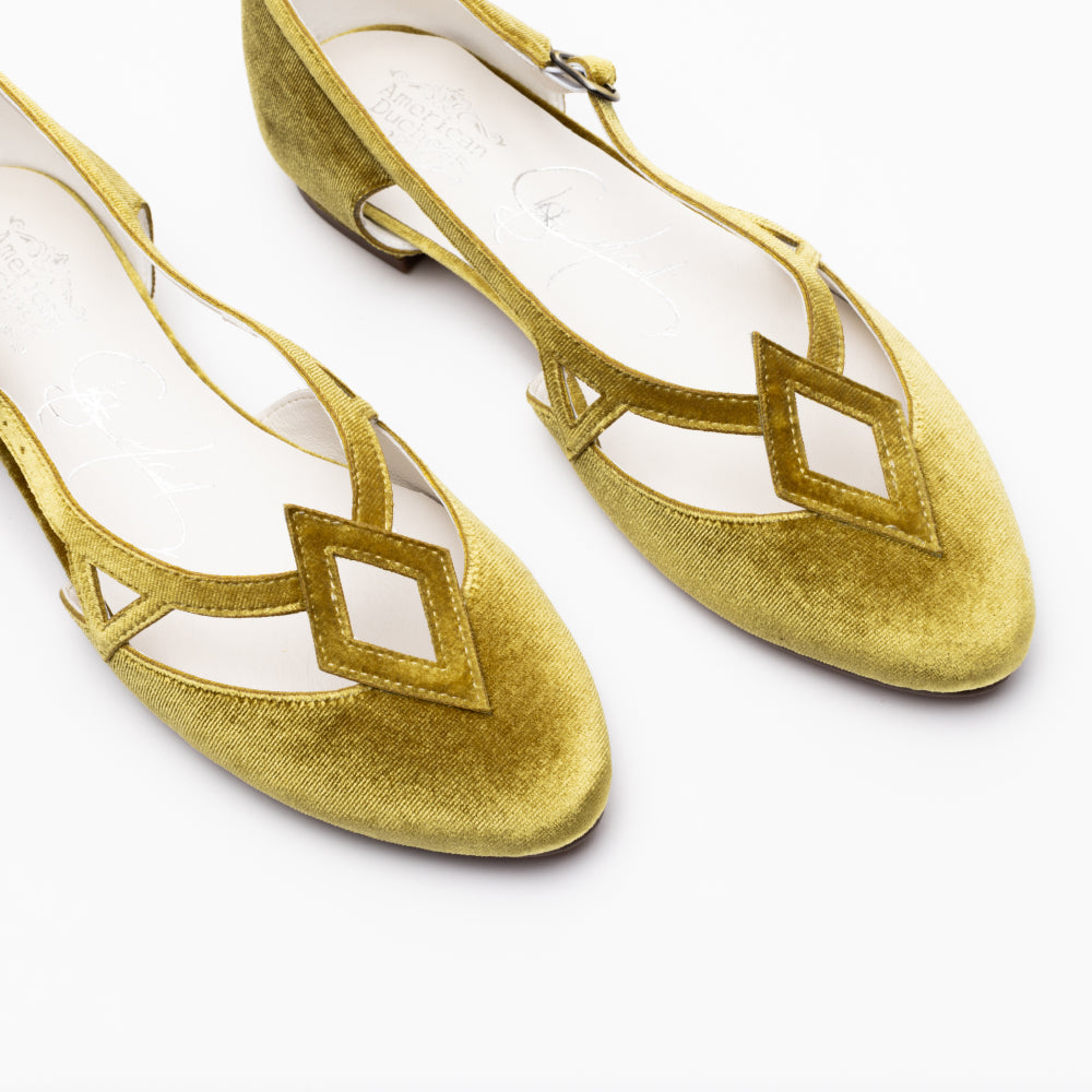 Step into a vintage-inspired fantasy with the Mildred Flats, from our collaboration collection with artist Christine McConnell! Inspired by 1950s 'flatties', these flats are unlike any you've seen before. Uppers in rich, luxe velvet, open sides, and strappy details festooned with geometric motifs make Mildred unique. Mildred features our dependable 0.5"/ 1.27 cm common sense heel, which is low and sturdy for all-day comfort. These shoes are festive, leather-free, and come in five gorgeous colorways.