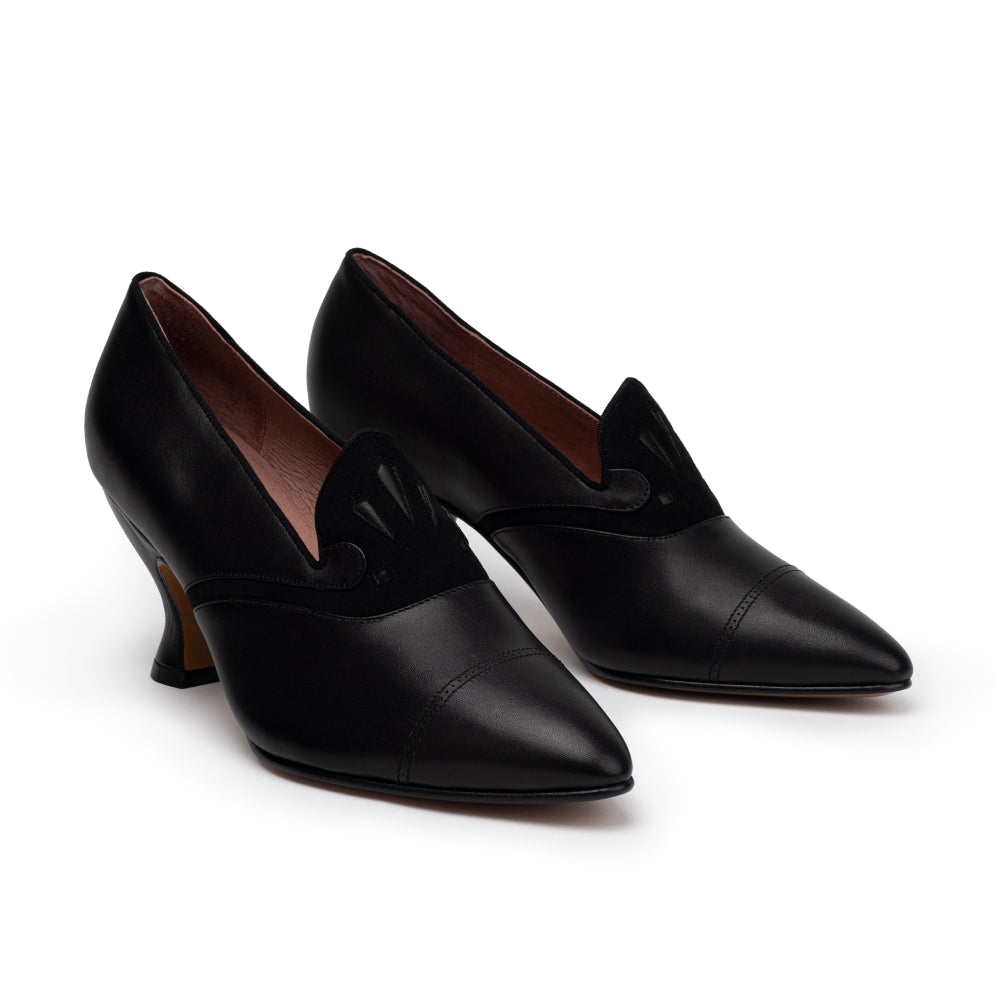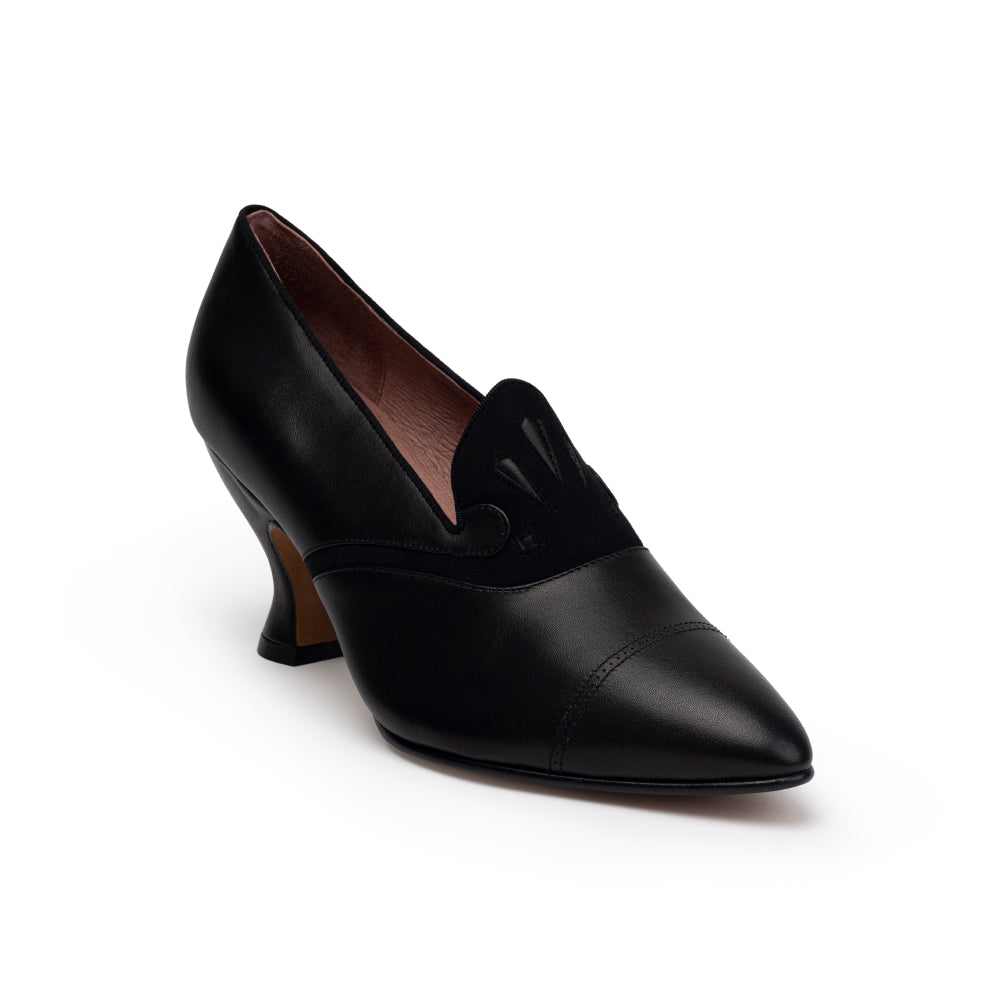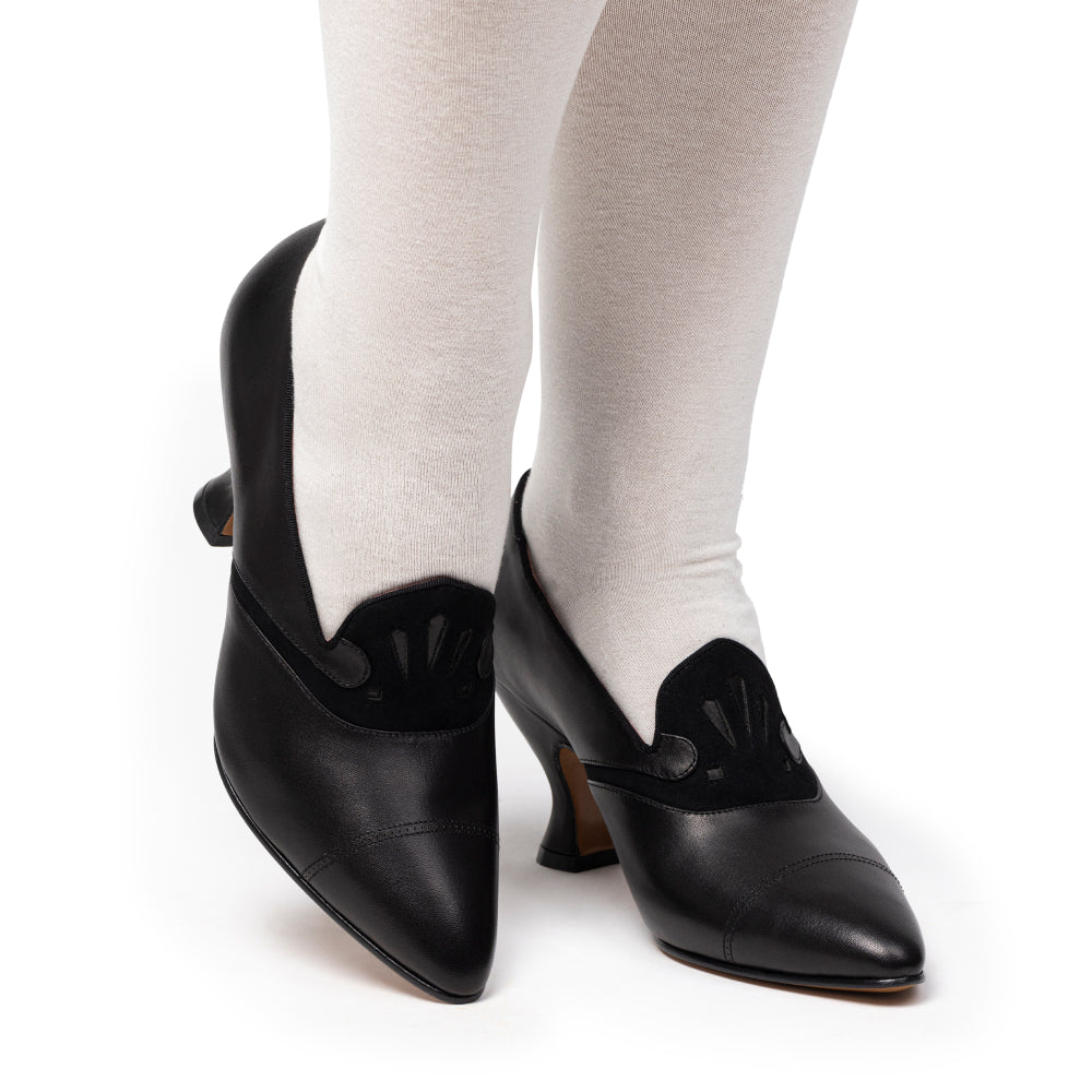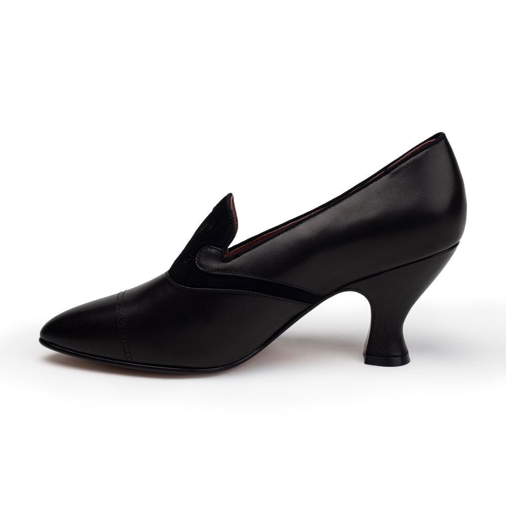 Be utterly beguiling in Elsie Pumps! Meticulously reproduced from period originals, Elsie is accurate to 1890 through 1920. These step-in pumps feature smooth leather and suede uppers in coordinating colors, as well as a distinctive shaped tongue with cutout detailing. Elsie features a custom, perfectly balanced 3”/ 7.6 cm French spool heel, so you can glide across the floor at any soirée. Elsie pairs wonderfully with tea and lingerie gowns as well as evening wear. To keep your Elsies looking spiffy, we recommend pre-treating them with Angelus Water & Stain Repellent.