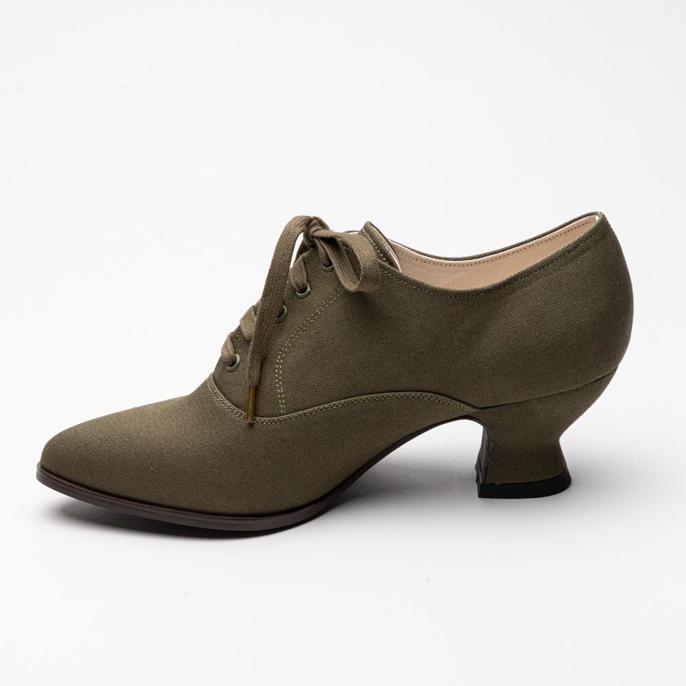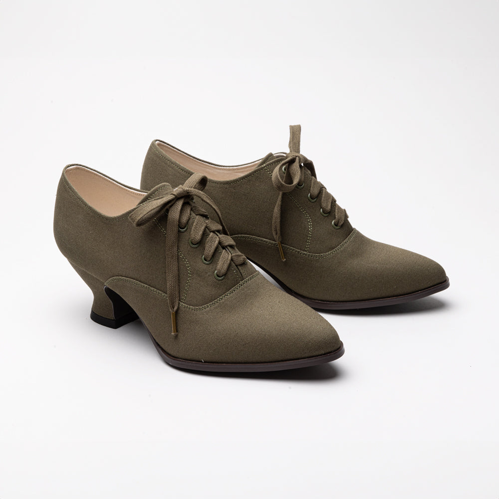 Meet the Kedwardians, the perfect light and breezy sporting shoes from the turn of the 20th century. Based on many original examples of early ladies' tennis shoes, the Kedwardians are made inside and out in cotton canvas paired with practical rubber soles and a stable and comfortable 2 in / 5 cm French heel. These Edwardian tennis shoes are leather-free, lightweight, easy to clean, and extremely comfortable.