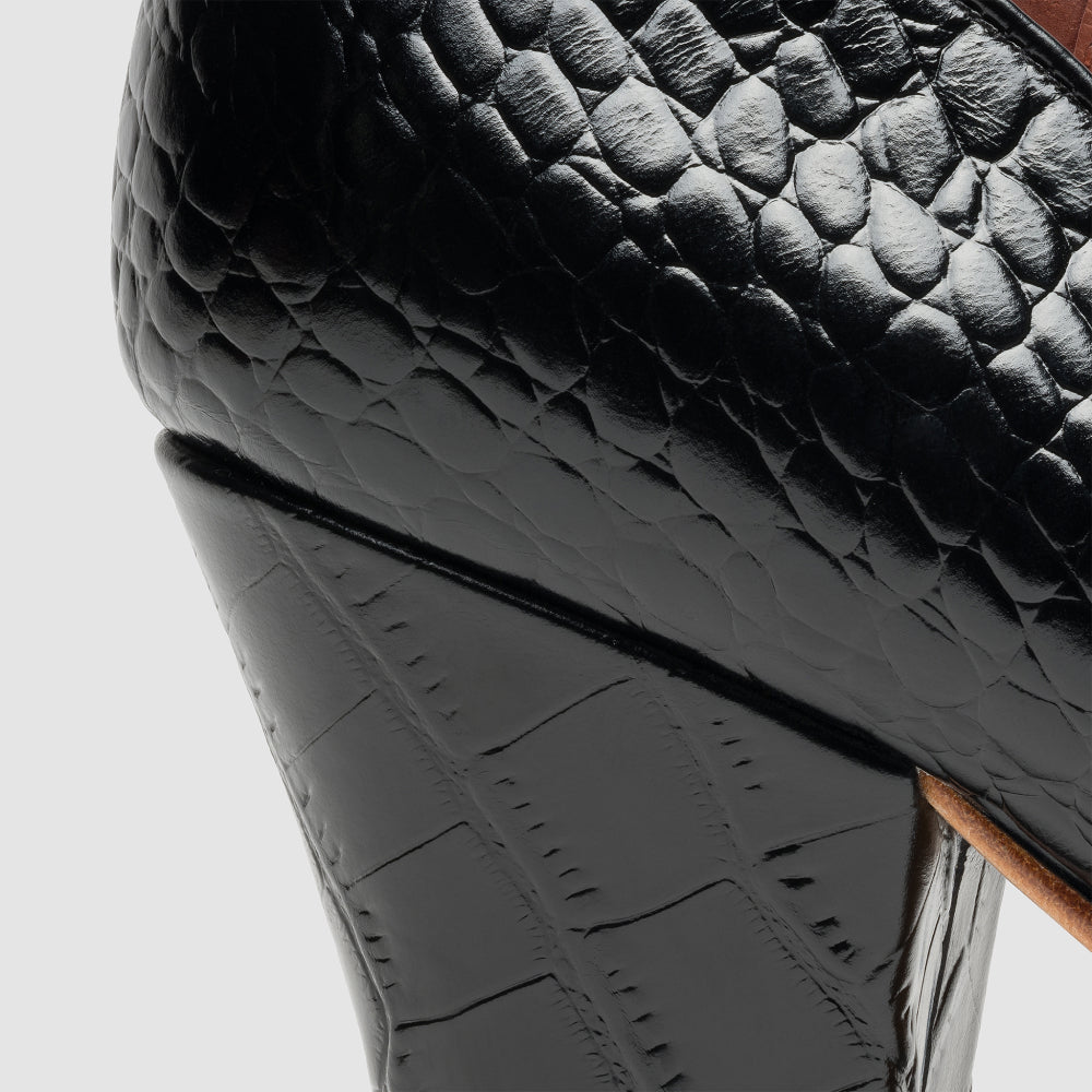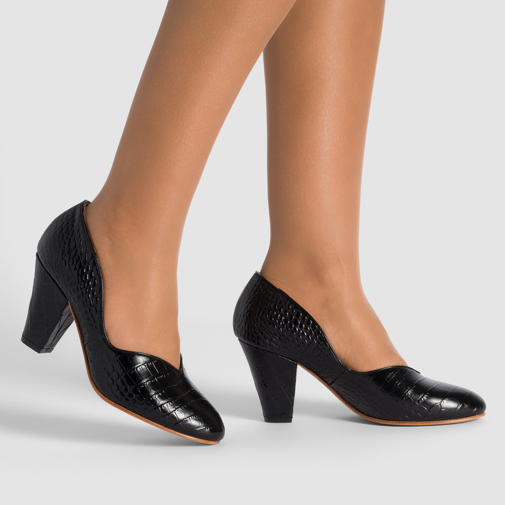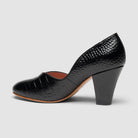 Step into a pair of our famous Marilyn 1940s Pumps, the quintessential vintage slip-on shoe for the late 1930s, 1940s, and early 1950s. Custom embossed leather uppers emulate the elevated, elegant, and in vogue mock croc pumps of the time. These beautiful reproduction shoes feature a curvaceous sweetheart vamp and rounded toes. Our custom 3"/ 7.72 cm reproduction '40s Cuban heel is stable and perfectly balanced for long-wearing comfort. Named for Marilyn Monroe, Marilyn pairs perfectly with just about every outfit for both day and evening.