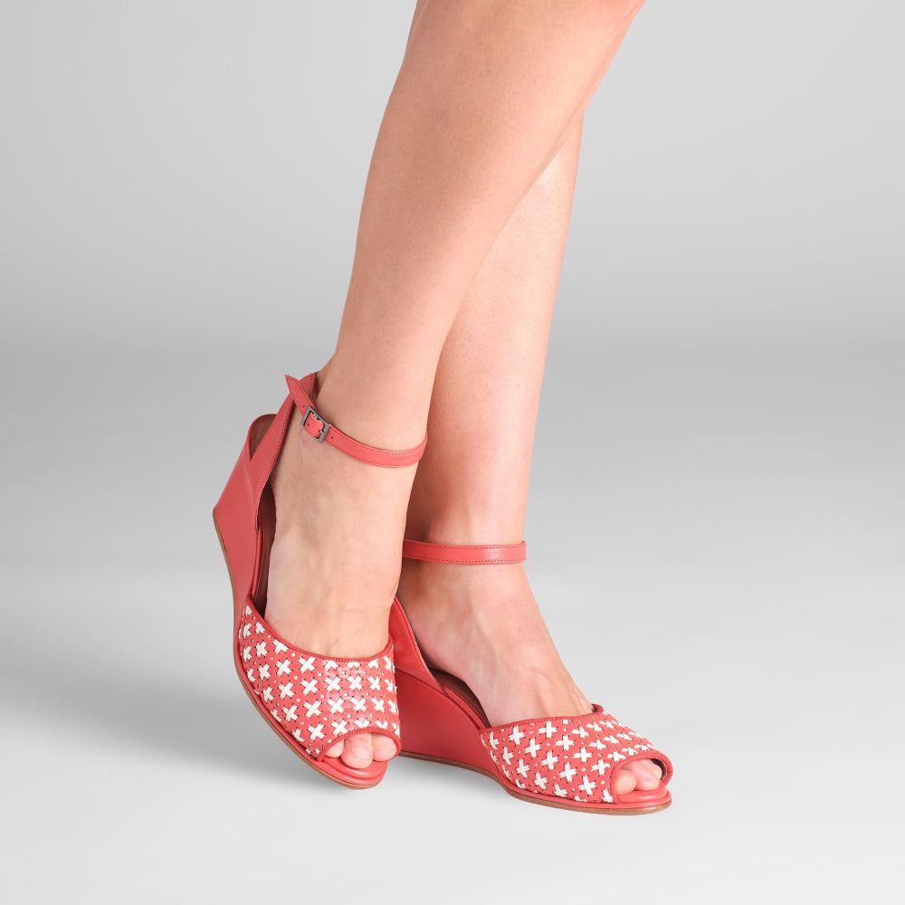 Judy brings a warm summer breeze to life with bold colors, rich textures, and a classic vintage silhouette. This gorgeous sandal features our custom vintage-reproduction 2.75"/ 6.9 cm wedge heel, which is carefully sculpted and balanced for all-day comfort. Judy's vamp is crafted from stunning interwoven two-tone smooth leather, paired with a matching smooth leather heel and straps. Accurate to the 1930s-1950s, these splendid sandals are the perfect vintage touch for any warm-weather outfit.