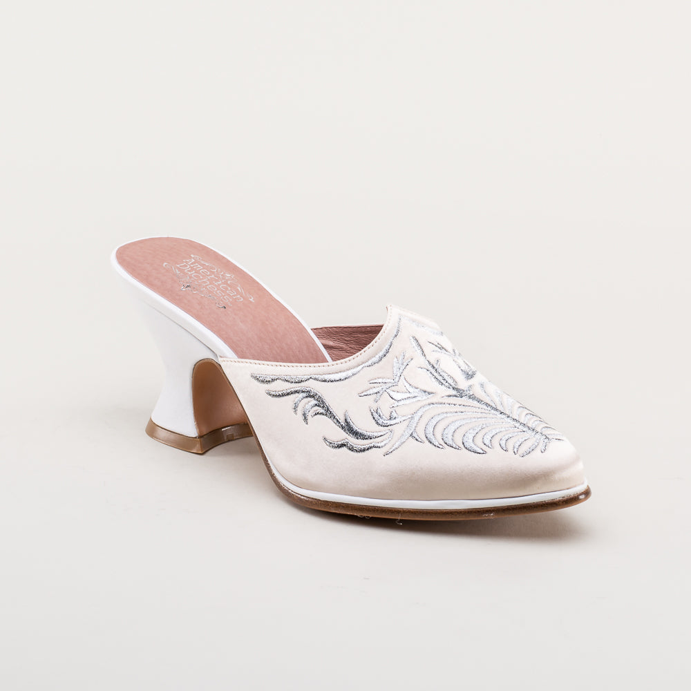 Antoinette 18th century mules present a gorgeous opulence in fancy footwear for your Georgian era impressions. Correct for c. 1700 - 1770s, these elegant backless heeled slippers are the ideal choice for fancy gowns fit for Versailles, with a superbly balanced French heel, leather lining for easy walking, and a softly pointed toe.
