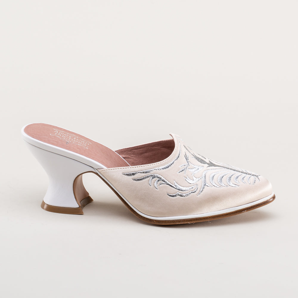 The Antoinette mules are made of durable materials specifically to withstand both indoor and outdoor wear, so don't be afraid of ruining your shoes between carriage and palace. These beautiful slippers are easily slipped on or off when fully dressed - no bending down to fasten buckles or ties - and the real leather lining keeps them securely on your feet.