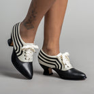 These attractive lace-up shoes have all the style and sass of footwear from c. 1900 through the 1920s and will keep you on your feet and comfortable all day, whether you're attending historical costuming events or walking the streets of New York City. Bernadettes feature our sturdy 2 inch / 5 cm French heel, welted hard-wearing leather soles, pointed toes, and an adjustable lace-up closure, plus all that style with eye-catching contrast stripes on all-leather uppers. Delicious!