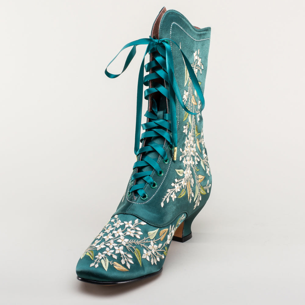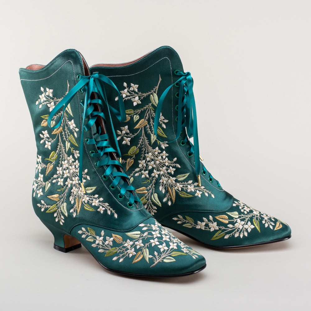 Indulge in a piece of history with Flora Embroidered Boots, an exclusive reproduction of the intricate opera and evening boots popular in the late Victorian period. Expertly crafted with intricate botanical detailing, these stunning satin boots will take you back to an era of sophistication and finesse. Wear them with bustle and Belle Epoque attire from the 1870s to c. 1900, or with modern dress as a statement piece.