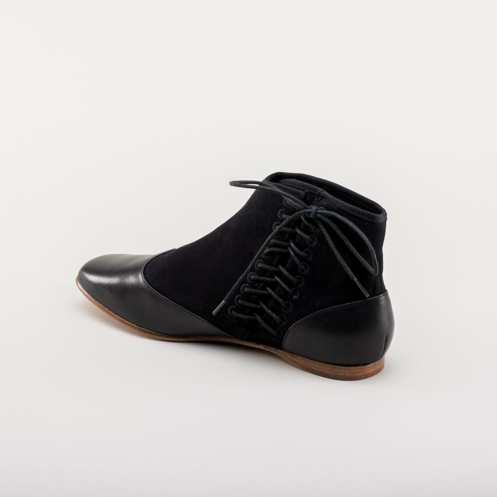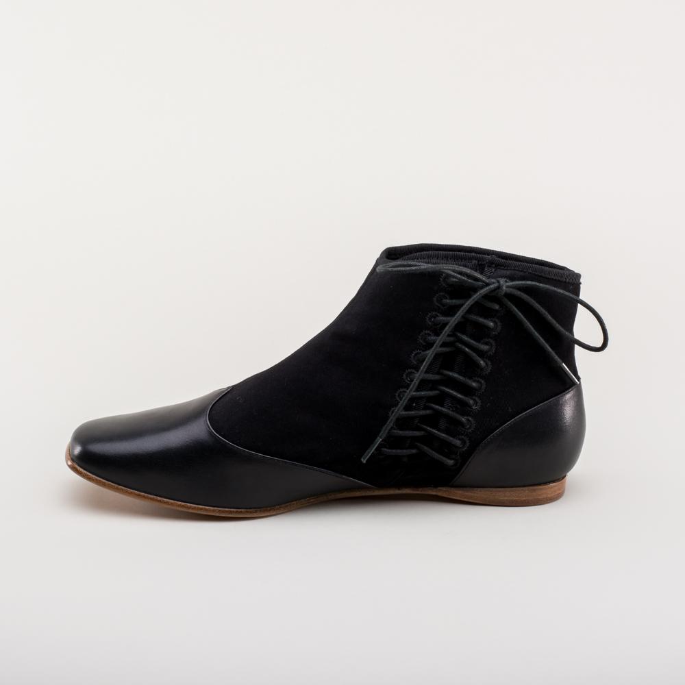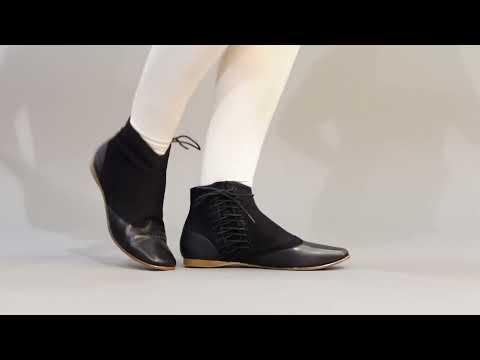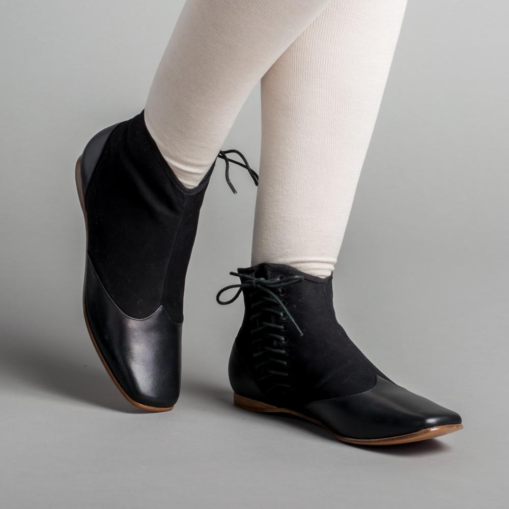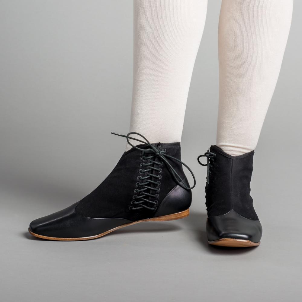 This popular style of Victorian ankle boot is made of a refined yet sturdy cotton sateen upper foxed with smooth calf leather on the toes and heels. The side-lace closure, unique to this period, makes it easy to get your boots on and adjusted just as you like. Wear Keckley Victorian boots for both day and evening dress, outdoor or indoor events, or with modern outfits for a secret nod to the past.