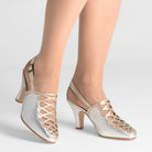 The alluring glamour of 1930s fashion comes to life with Hedy, a shimmering footwear confection. These strappy slingbacks are resplendent in richly colored silks, topped with finely detailed, surrealist lattice cutouts over the instep in coordinating metallic leathers. Or, try Hedy in all-smooth leather silver and gold, for a mixed metal sensation. Hedy is built on a beautiful new 1930s last, with a custom, 3.25"/8.25 cm Spanish heel. Strap these gorgeous shoes on to instantly become a star!