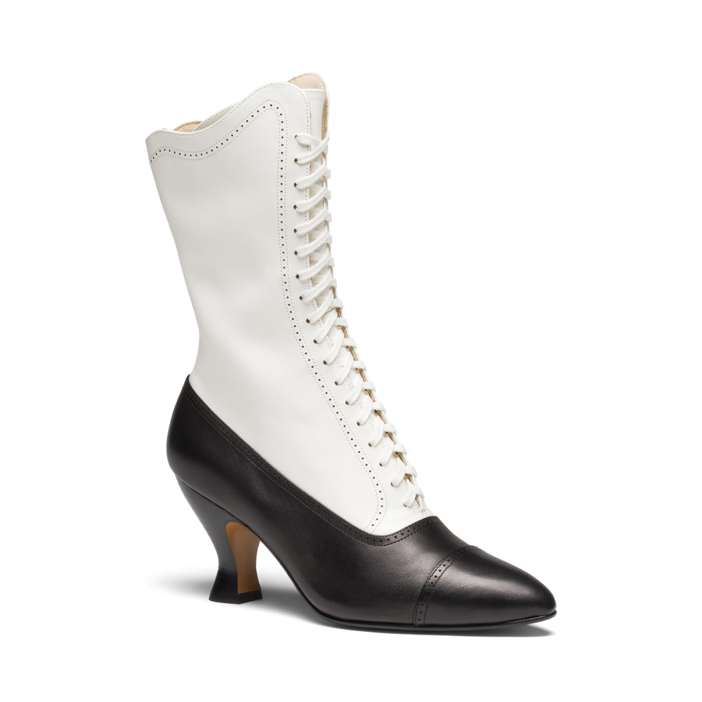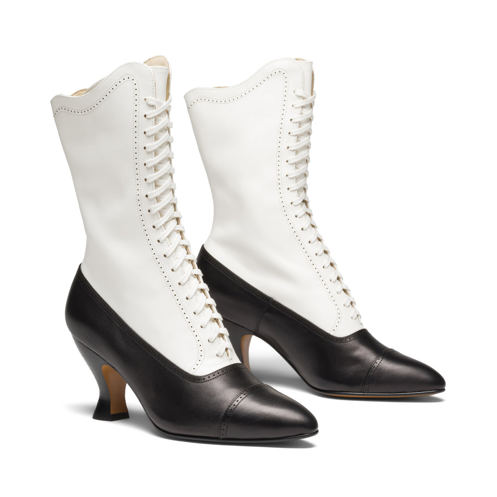 Introducing Edith, the spool-heeled Edwardian boot you have been dreaming of. Carefully designed and based on antique originals, Edith is accurate to 1890 through 1920. Edith features a custom, curvaceous, and perfectly-balanced 3”/ 7.6 cm French spool heel, which makes an ideal base for our custom last. Edith’s super-soft leather uppers are crowned with a splendidly shaped top, and set off by handsome broguing on the shaft and toecap. The period-accurate curve along the back of the boot gracefully hugs the calf, just like real Edwardian boots. Available in both standard and wide width, Edith fits a wide range of calf sizes. Each pair of Ediths comes with two sets of laces, for increased adjustability. The top of Edith Boots do not extend to the widest part of the calf muscle. Measurements scale slightly based on size.