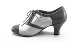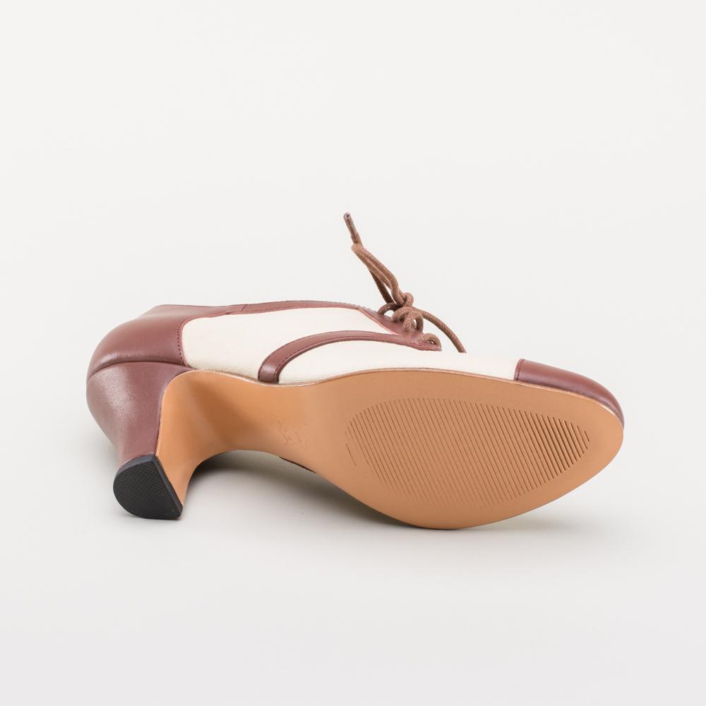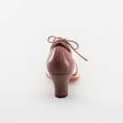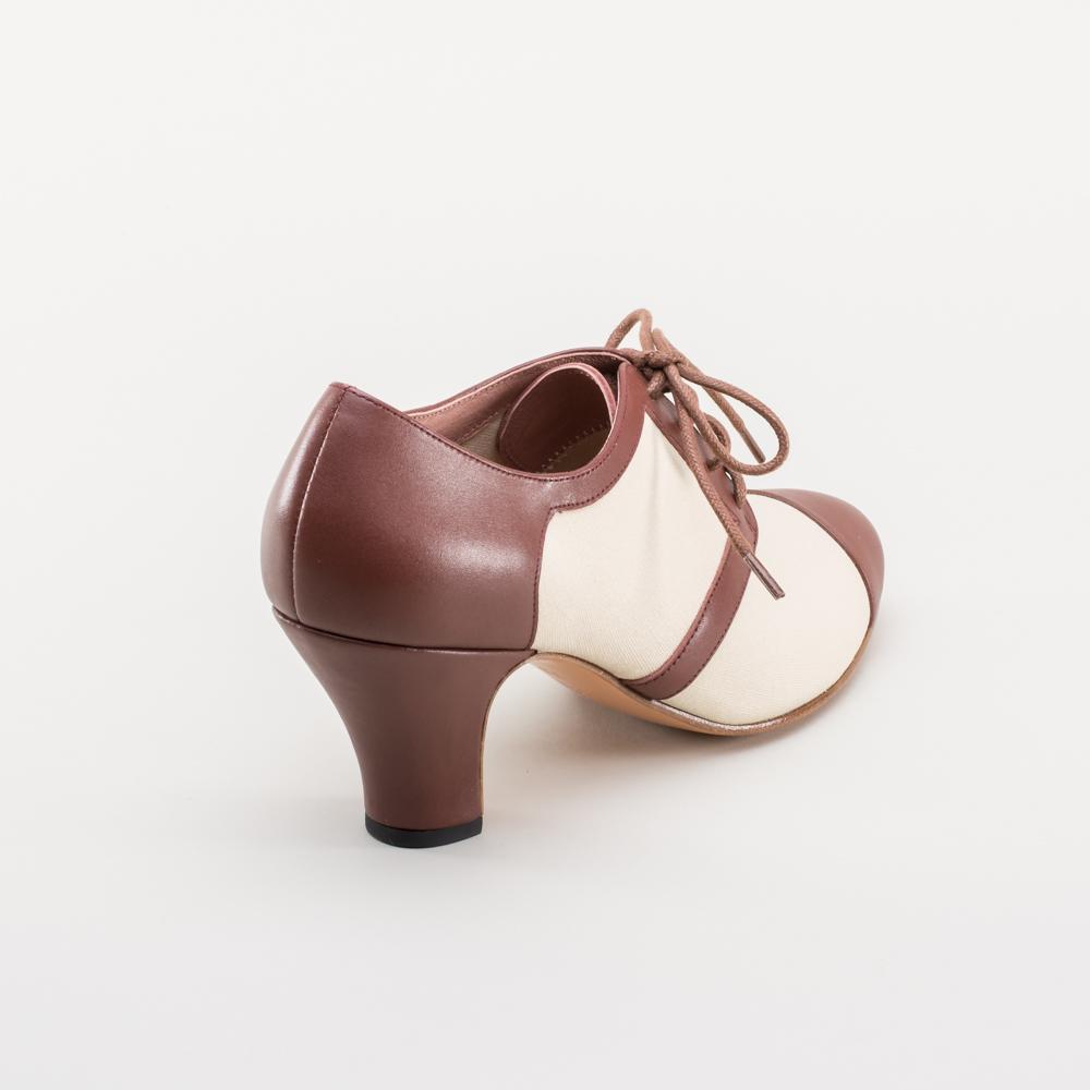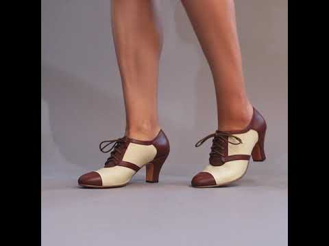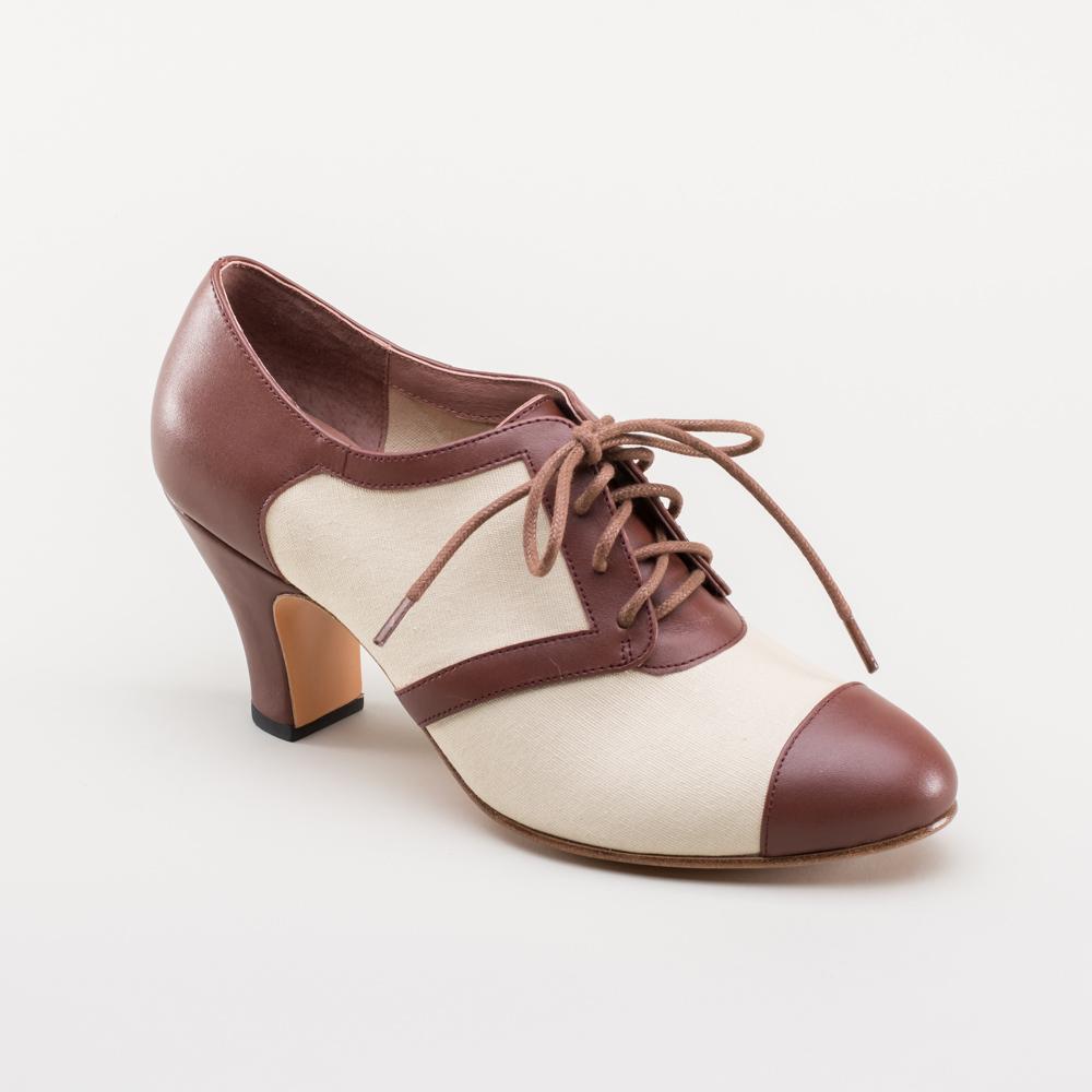 How better to complete a 1920s or 1930s sporty ensemble than with a perfect pair of Evelyn oxfords? These retro spectator oxfords are made of tan canvas combined with a rich brown leather on a 2 3/8" / 6 cm Spanish heel and insole arch support.
