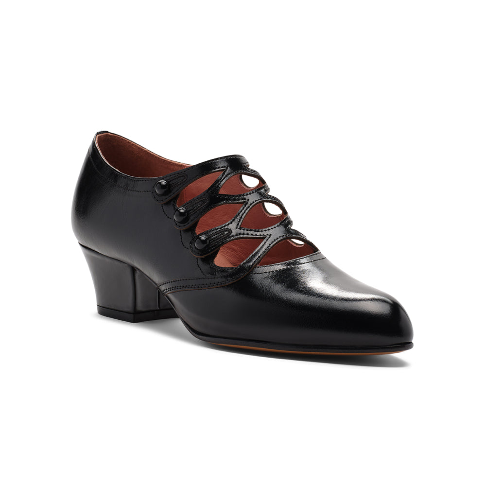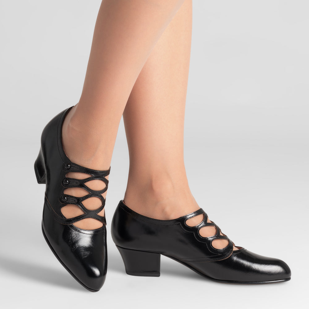 Gloria seamlessly combines all of the elegance of 1910s/1920s footwear with practicality, resulting in a refined shoe fit for all-day wear. Finely detailed leather straps with period-authentic cutouts glide gracefully over the vamp and close with functional matching buttons. Gloria's comfortable almond toe and stable, 1.6"/4 cm Cuban heel make this shoe suited for promenades on the boat deck and dancing the night away. This wonderfully versatile shoe is accurate to the 1910s all the way through to the 1940s. Gloria is available in both standard and wide width.