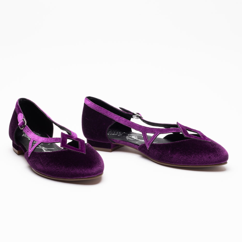 Step into a vintage-inspired fantasy with the Mildred Flats, from our collaboration collection with artist Christine McConnell! Inspired by 1950s 'flatties', these flats are unlike any you've seen before. Uppers in rich, luxe velvet, open sides, and strappy details festooned with geometric motifs make Mildred unique. Mildred features our dependable 0.5"/ 1.27 cm common sense heel, which is low and sturdy for all-day comfort. These shoes are festive, leather-free, and come in five gorgeous colorways.