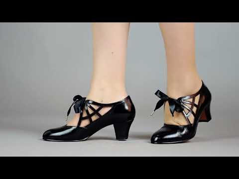 Meet the fantastically spooky Parker pumps, perfectly period for the 1920s all the way through to the 1960s. These fun and funky little vintage shoes feature round toes, a new 2 in / 5 cm Cuban heel, and the eye-catching spiderweb vamp with satin ribbon ties. These cuties are direct reproductions of an extant pair of 1920s shoes along with the catalog advertisement.