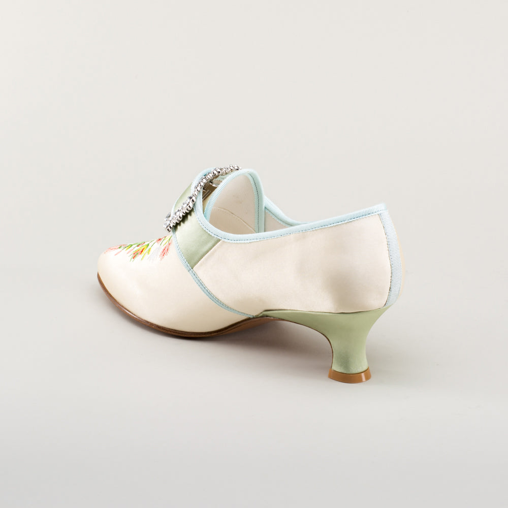 Step back in time with the delicious Primrose 18th century shoes. This authentic embroidered satin design has been recreated in collaboration with The Bata Shoe Museum, capturing the look and feel of the original shoes from 1770s-1790s. Made on the Dunmore last and 2 inch / 5 cm heel, you can be sure that style doesn't mean sacrificing comfort.